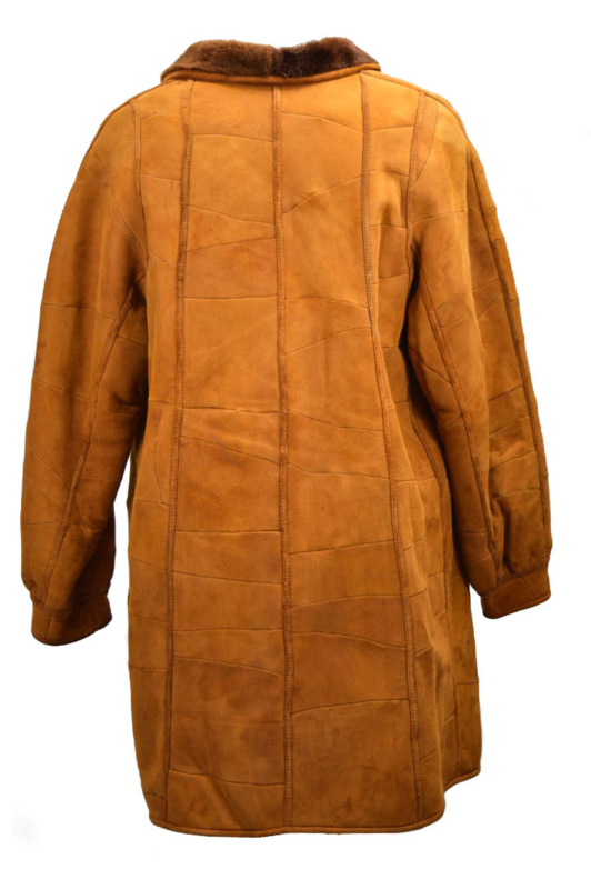 Soepel en lichte jas van patchwork lamsvacht met een raglanmouw met manchet. Heeft een kleine beschadiging rechtsboven aan de voorkant