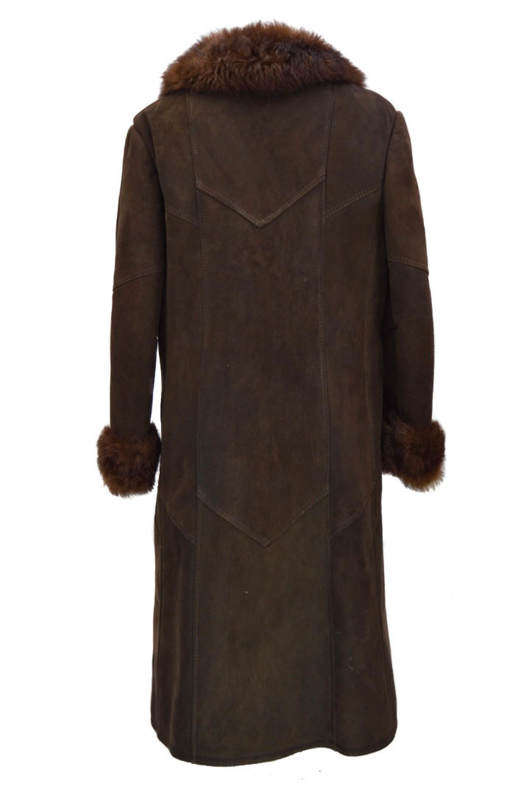 Prachtige rechte jas van lamsvacht met extra lange mouw. De zak en voorsluiting zijn afgezet met leer.